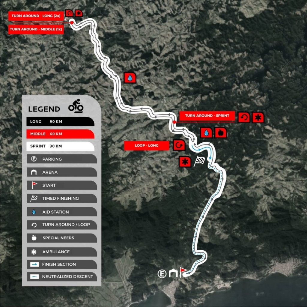短距离选手将在出发点约22.5公里处折返。中距离与长距离选手将持续前进,其折返点位于出发点约35.5公里处。